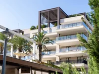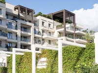 Внутренняя площадь квартиры составляет 66 м2 и состоит из прихожей с гардеробом и гостевым туалетом, гостиной открытой планировки с камином, столовой и кухни, оборудованной техникой Miele, и спальни с ванной комнатой. Терраса площадью 22 м2 окружена зеленью и имеет частичный вид на море. Гаражное помещение включено в стоимость.