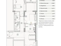 Квартира занимает площадь 79,19 м2 и расположена на первом этаже здания, состоящего из четырех этажей. В квартире есть два туалета, обеспечивающие дополнительный комфорт для жильцов. Комплекс оснащен современным лифтом, а для тех, кто ищет дополнительное удобство, есть возможность приобрести парковочное место в гараже по цене от 22 000 до 25 000 евро.
