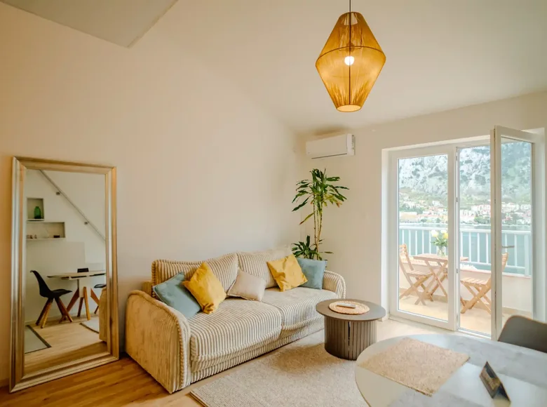 Located in the charming coastal village of Muo, just 2 km from the historic Old Town Kotor, this stylish and comfortable apartment offers beautiful panoramic views of the Bay of Kotor and Kotor Fortress. The seaside is only about 150 meters away, while the center of Kotor can be reached with a pleasant 20-minute walk along the bay. Apartment Overview This cozy and functional apartment of approximately 50 m² (including two balconies and a mezzanine sleeping area) is located on the third level of the house, positioned like a ground-floor entrance, making it very convenient when arriving with luggage. Layout Private entrance hallway Bedroom with balcony Bright living room with kitchen Second balcony with stunning bay views Modern bathroom with a window Mezzanine sleeping area with a spacious double bed (2 m) Key Features Panoramic view of the Bay of Kotor and Kotor Fortress Two balconies Private entrance Private parking space Quiet residential environment Only 150 m from the sea Capacity & Potential The apartment can comfortably accommodate up to 6 people, making it an excellent option for: Holiday living Short-term rental investment Vacation property near Kotor Thanks to its prime location near Old Town Kotor and beautiful sea views, this property represents a great opportunity for both personal use and rental income.
