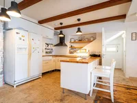The ground floor is an open space, with a dining area, fully equipped kitchen, and relaxing area with huge sofa beds and TV. There is also a full bathroom on this floor.