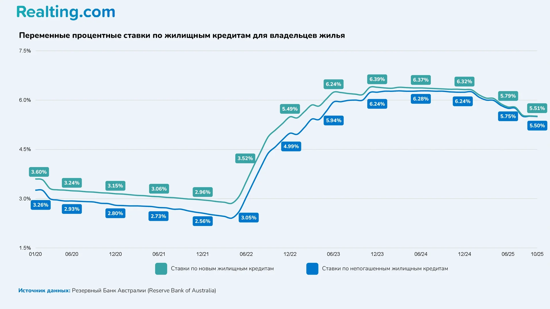 Согласно статистике Резервного Банка Австралии (Reserve Bank of Australia), процентные ставки по кредитам снижались на протяжении всего 2025 года. Если в начале года средняя процентная ставка для новых жилищных кредитов составляла 6.25%, то к октябрю ставка снизилась до 5.50%. Однако текущие ставки по кредитам все еще намного выше, чем несколько лет назад.