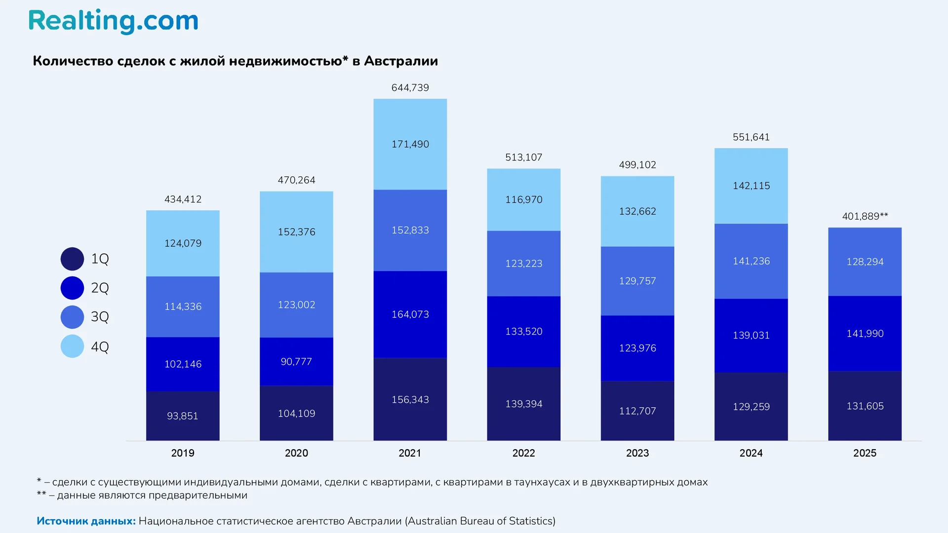 Важно добавить, что приведенные выше данные являются предварительными и будут пересмотрены. Это значит, что в дальнейшем итоговое количество сделок в 3-м и 2-м кварталах 2025 года вырастет. Так как 2025 год подходит к концу, в первом квартале следующего года Национальное статистическое агентство Австралии опубликует данные о числе сделок в последнем квартале 2025 года, а также предварительную оценку суммарного числа сделок с жильем за весь 2025 год. Уже сейчас можно говорить о том, что итоговое количество сделок на рынке жилой недвижимости в 2025 году будет как минимум сопоставимо с результатом 2024 года, а как максимум превысит его.
