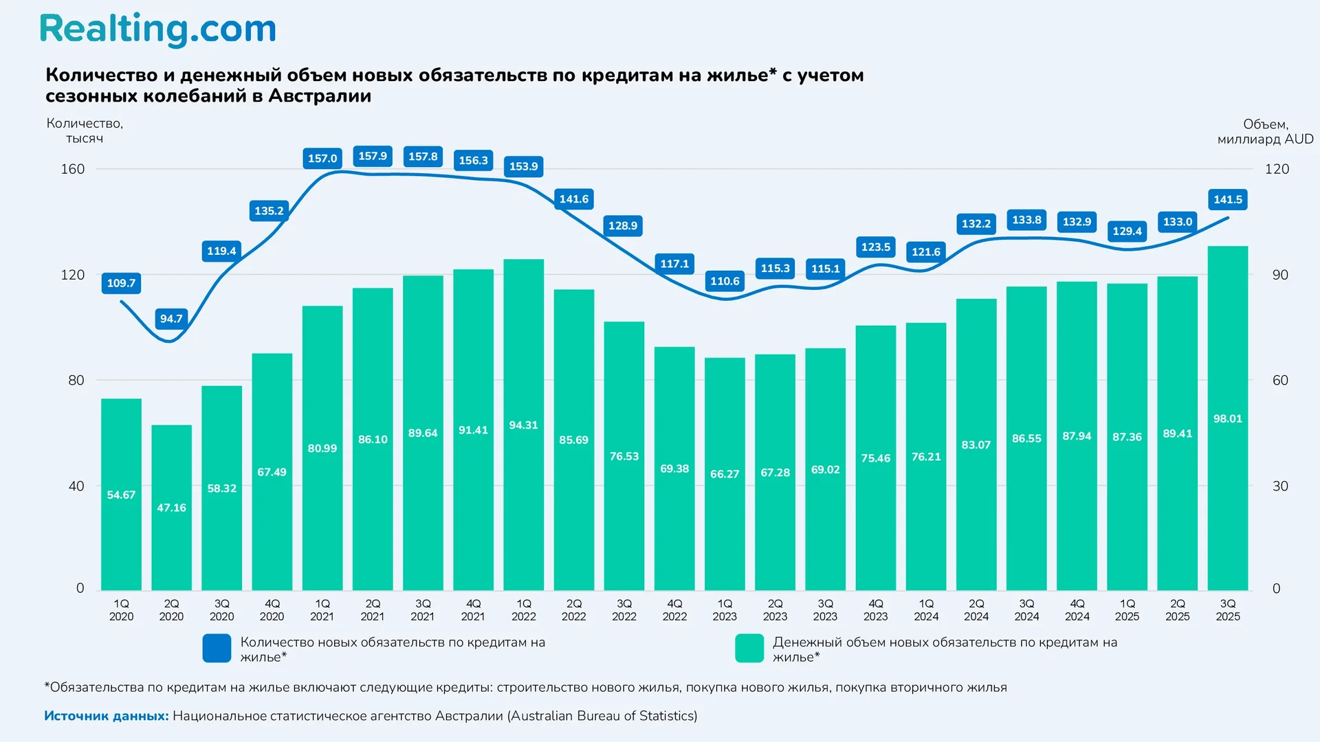 Данные Национального статистического агентства Австралии (Australian Bureau of Statistics) гласят, что в 3-м квартале 2025 года в стране было зарегистрировано 128,294 сделки купли-продажи жилой недвижимости. Количество сделок в 3 квартале 2025 года было на 9.65% меньше, чем во 2 квартале этого же года и на 9.16% меньше, чем в 3 квартале 2024 года.