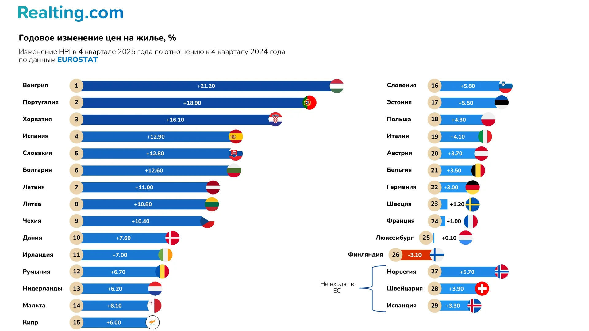 Итоги 2025 года показывают, что европейский рынок жилья вошел в фазу устойчивого, но неравномерного роста. Если в одном статистическом пространстве одновременно сосуществуют спад в Финляндии, почти нулевая динамика в Люксембурге, а также двузначное удорожание в Венгрии, это означает, что национальные рынки движутся уже не в одном цикле.
