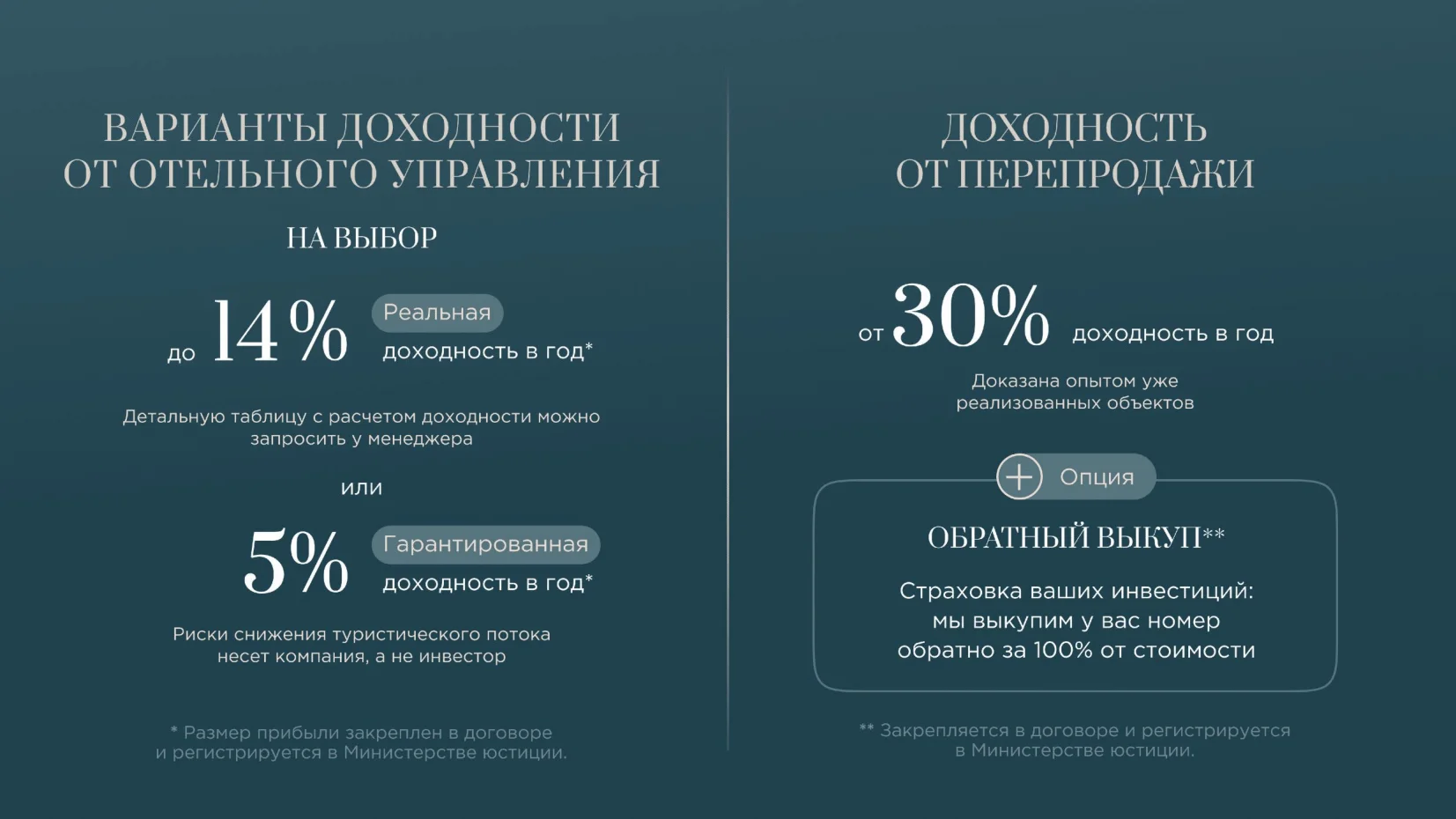 - Доход с аренды (долгосрочной или посуточной). Что касается дохода с аренды, самые высокие показатели доходности у международных управляющих компаний типа Ambridge Hospitality. Они занимаются управлением брендовыми, международными отельными сетями и иногда даже могут предложить гарантированную доходность инвесторам от 5 до 9% ROI в год. Это становится возможным благодаря работе с пакетными туристами и туристическими компаниями. Поэтому инвестиции в брендовую недвижимость являются настолько финансово привлекательными.