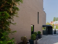 Здание с элегантной архитектурой, высоким стандартом отделки и ухоженными зелеными зонами с обеих сторон.