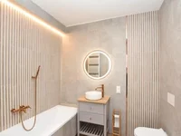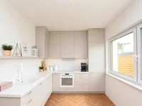 The apartment comes partially furnished, including custom-made kitchen furniture and high-quality appliances like an oven with an induction hob, dishwasher, extractor hood, and fridge. The living room is tastefully furnished with a sofa, coffee table, armchair, wardrobe, and TV cabinet, providing an inviting space for relaxation.