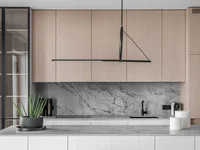 на полу дубовая доска Встроенная мебель на заказ облицовка стен из шпона / зеркала под заказ арматура компании Tres дверь со скрытой дверной коробкой цвета стен полное кухонное оборудование от известных брендов кухонные принадлежности Blum шторы на заказ