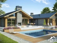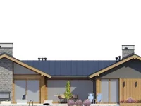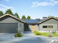 The proposed house is a project of a modern single-storey house that stands out from its surroundings. It is characterised by numerous glazings and an interesting body of work. The right side of the house features an open-plan living zone with a bright living room, a spacious kitchen and a large dining room. A larder and a toilet are located in the connector between the private and living areas. The private area is planned on the garden side. It consists of a shared bathroom and three bedrooms, one of which has a separate dressing room and bathroom. A two-car garage and a boiler room complete the space.
