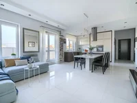 Расположена на последнем этаже 6-этажного дома 2009 года. В квартире гостиная с кухней 33,59 м², две спальни 14,31 м² и 10,57 м², ванная с ванной 5,99 м², ванная с душем 4,17 м², гардероб 3,27 м², холл 10,02 м².