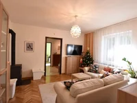 Общая жилая площадь около 65 м², включает холл, ванную, кухню, три жилые комнаты (одна проходная), а также подвал с котельной.