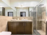 Ванная комната с большой душевой кабиной и встроенной стиральной машиной.