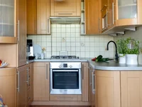 В квартире светлая гостиная с кухонным уголком, кухня выполнена на заказ и оснащена посудомоечной машиной, газовой плитой, духовкой и встроенным холодильником с морозильной камерой. В спальне — глубокий шкаф для хранения. Отдельный второй жилой комнатой и ванная с душевой кабиной. Есть балкон, с которого открывается приятный вид на деревья Park Promenada.
