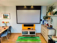 Качественный дубовый паркет создаёт уютную атмосферу. В гостиной установлен экран для проектора, убираемый в потолок и инфраструктура для домашнего кинотеатра. В кухне и ванной — тёплые полы. Квартира оснащена кондиционером и всей бытовой техникой.