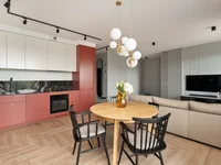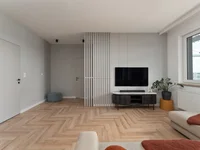 Элегантная квартира на 7-м этаже современного дома (2022 г.), с просторной дневной зоной (41 м²), высоким качеством отделки, угловой экспозицией и панорамным видом на Варшаву.