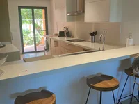 Гольф - курорт. Апартаменты на 2 комнаты, угловые, с зеленой территорией. Окна на восток и запад. Новый ремонт. 3600 в год за кондоминиум, около 100 в месяц за коммуналку. Во дворе бассейн с баром, огороженный живой изгородью. Место тихое. 3000 евро в год за членство в гольф-клубе на 2 человек и 20% скидка на ресторан и прочие услуги на территории. В стоимость кондо включена уборка территории, ландшафтный дизайн, тренажерный зал и многое другое. Есть централизованная аренда при необходимости за 40%, стоимость 2200 евро в неделю или 400 евро за ночь Гросс. Собаки не допускаются, однако для жильцов это правило не действует согласно закону. Летом шатл до моря и обратно. В квартире 2 спальни, 2 санузла, один с ванной, столовая, объединенная с кухней. Терраса и балкон с доступом прямо из дома. Бассейн из дома не видно, очень изолированный уголок. Окна на восток и запад. Теплые полы по всему дому, двойные стеклопакеты, москитные двери. Жильцы - американцы вложили много денег в ремонт. Новая кухня с техникой класса люкс, межкомнатные двери из массива. Центральный пылесос, везде кондиционеры. Вода на территории не оплачивается, только внутри, около 10 евро в месяц. Муниципальный налог 400 евро в год. Охраняемая территория. Высокие потолки. Площадь квартиры 103 м2, с террасами - 135 м2. Есть подземная парковка на 2 машины и кладовая. Отдельно 8% налог.