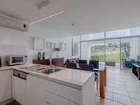 1-bedroom villa, 75 sqm (construction gross area), with communal garden and swimming pool, in the Bom Sucesso Resort gated community, in Óbidos. The villa, designed by Architect Nuno Graça Moura, stands out for its light thanks to the excellent southern sun exposure and views of the garden and swimming pool. Spread over two floors, it has, on the upper floor, a 15 sqm mezzanine bedroom, a walk-in closet and a bathroom. On the lower floor, a 28 sqm open plan living room and kitchen, with access to a covered 15 sqm terrace and a private garden (38 sqm). Both also have direc access to the communal garden of the plot where we can find the swimming pool (almost 20,000 sqm). There is also a full bathroom and pantry on this floor. The villa is equipped with reversible air conditioning, electric boiler and all kitchen equipment is BOSCH brand. It has a communal parking area for the plot residents. It is sold furnished and equipped with everything needed for tourist operation.
