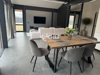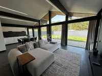 - Общая площадь дома составляет 144 квадратных метра, включая жилую зону 85 квадратных метров, а также террасу и просторный банный комплекс площадью 44 кв. м. с парилкой 27 кв. м. и панорамным видом.