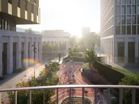 Двухуровневое благоустройство (второй уровень – стилобат) с парящим мостом, детскими и спортивными площадками, зонами для отдыха и общения и центральной площадью, разработанное архитектурным бюро Kleinewelt Architekten, является продолжением общей концепции комплекса.