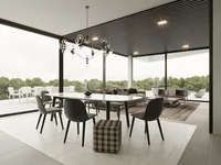 Ориентация комнат и наличие больших окон способствуют постоянному сосуществованию интерьера и экстерьера дома, позволяя объединить среду и формируя часть единого визуального пространства.