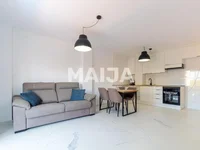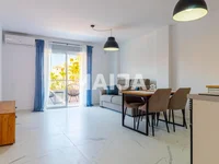 Недвижимость имеет одну спальню со встроенным гардеробом, одну ванную комнату и просторную, яркую гостиную с кухней открытого плана, полностью оборудованную бытовой техникой. Гостиная имеет доступ к террасе площадью около 12 м2 с открытым видом на бассейн, а слева - вид на море.