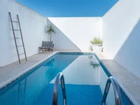 Из кухни есть выход во внутренний двор, где расположена удобная хозяйственная зона с местом для стиральной машины, наружный санузел и вход в частный сад. Сад выполнен в формате минимального ухода с использованием искусственной травы и включает частный бассейн, окруженный высокими стенами. Это обеспечивает отличный уровень приватности и создает идеальное место для отдыха, загара или встреч с друзьями и семьей.