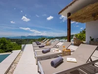 The villa has a sleeping area with private bathrooms and terraces, a sitting area with a living room and fully equipped kitchen, laundry room, 2 terraces with outdoor seating area, billiard room and bar area.