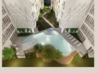 Внутри комплекса находится двор с садом и бассейном, а парковки расположены на нижних этажах каждого здания.
