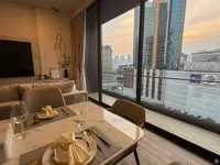 Comfortable, Light-Filled LivingThis 85 sqm condo on the 19th floor offers a nicely laid-out open-plan living and dining area that’s really the heart of the home. You’ll probably spend most of your time here—the floor-to-ceiling windows bring in loads of natural light, and the neutral tones with wood-look flooring create a warm and inviting vibe. There’s a large beige sofa perfect for relaxing in front of the built-in entertainment unit with a big flat-screen TV, plus a round coffee table and plush rug that nicely soften the space.Functional Kitchen and DiningThe kitchen is modern yet approachable, featuring a kitchen island with two black bar stools, plus wooden and white cabinetry that keeps it fresh and clean. Polished stone tiles on the floors add a slightly luxe feel while being practical. The marble dining table seats four comfortably with upholstered chairs, making it great for hosting or casual meals.Bay-View Balcony & BedroomsThe balcony has wooden decking, a nice spot to step out and enjoy some fresh air with views of the surrounding commercial buildings—not the busiest, but enough to feel connected to the city. The king-sized bedroom feels restful and uncluttered with a gray upholstered headboard and plenty of storage. Light-colored curtains give privacy without sacrificing the airy feel.Bathroom HighlightsThe bathroom has a spa-like quality, with natural stone tiles, a freestanding tub, and a double sink vanity with marble countertop. The shower is glass-enclosed with a rainfall showerhead, which adds a modern touch. Plenty of storage under the vanity and a large mirror with integrated lighting make this space both stylish and practical.Overall, this place is a solid choice if you want something move-in ready with a good blend of comfort, style, and a bit of that city buzz without feeling overwhelmed.