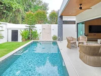 Outside, a covered terrace offers space for lounging or dining beside the private pool, surrounded by tropical greenery.