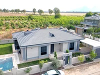 Вилла построена на участке 562 м², с общей полезной площадью 200 м². Среди удобств — собственный бассейн, зимний сад с чугунной печью, крытая парковка на 2 автомобиля, кладовая и техническое помещение. Для дополнительного комфорта предусмотрены система автоматического полива и солнечные панели для нагрева воды.