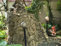 Красивая территория с фонтаном, садом, террасой и зоной барбеккю. Парковка для 5 автомобилей, а также гараж.