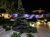 Отдельно стоящий гараж на две машины с комнатой для охраны. Бассейн с гидромассажной ванной. Ухоженный ландшафт с эксклюзивными растениями.