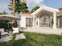 Высокие потолки. Есть кладовая и топочная в доме. Межкомнатные стены - 20 см, есть утепление базальтовой ватой. Терраса выложена плиткой. Крыша из натуральной черепицы, фасад травертин.
