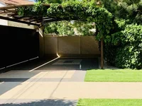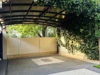 Высокий, зеленый двор со сложным ландшафтным дизайном.