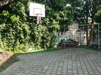 Располагается на участке, площадью 8 соток. Двор ухоженый с зелеными насаждениями. На территории есть уютная зона отдыха с бассейном и барбекю.