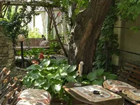 Во дворе уютное пространство для отдыха с зоной барбекю. Облагорожен зелеными насаждениями цветов, кустов и деревьев. Место для парковки 5-6 автомобилей, а также гараж