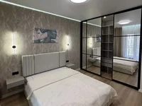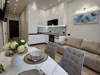 Планировка продумана до мелочей: просторная комната с выходом на террасу, отдельная гардеробная и вместительный шкаф в прихожей, полностью оборудованный санузел, современная встроенная кухня с комплектом техники.