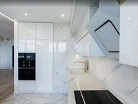 Планировка включает три спальни, кабинет с выходом на лоджию и просторную кухню-студию, оснащённую техникой Bosch и Liebherr. Кухонные фасады REHAU Crystal, фурнитура Blum, кварцевая столешница, система обратного осмоса и измельчитель отходов InSinkErator подчёркивают высокий уровень оснащения.
