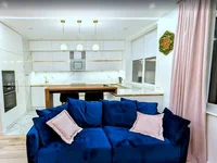 Интерьер выполнен в спокойной премиальной палитре с использованием натурального дерева, велюра, мрамора и декоративных акцентов. Пространство наполнено светом и ощущением уюта.