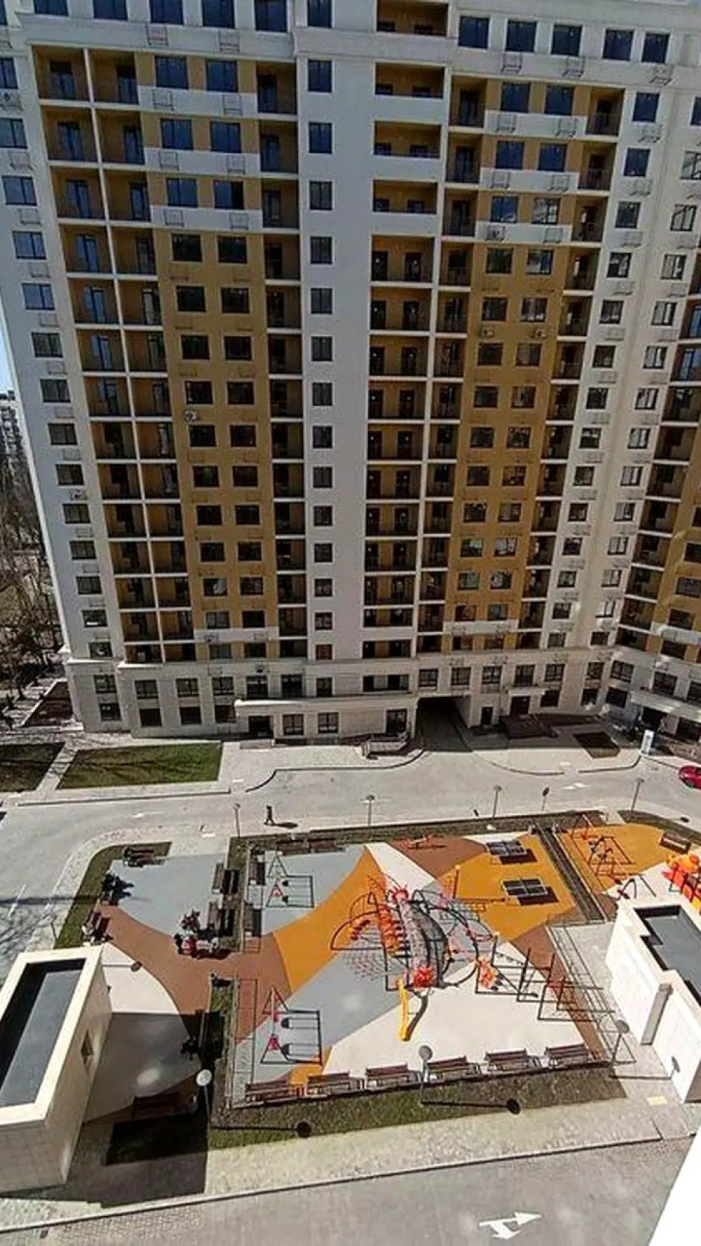 Двор без машин ,с зонами отдыха и детской площадкой.гостевая парковка,паркинг. Территория закрытого типа с видеонаблюдением и круглосуточной охраной, доступ за чипами.