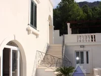 * Большая терраса-патио с балюстрадами и колоннами из цельного белого мрамора, выполненная в стиле средневекового Дубровника, деревянная беседка опирается на 4 огромных монолитных колонны из белого мрамора, покрытые и обвитые экзотическими местными виноградными листьями.