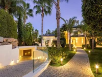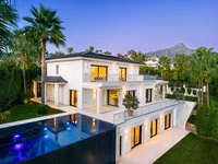 OPULENT VILLA WITH GOLF VIEWSStep into luxury with this frontline golf villa in the heart of Nueva Andalucía. Situated on a generous corner plot, the property offers stunning views of the golf course and La Concha Mountain. Surrounded by lush greenery, it offers a private retreat, accentuated by a grand driveway with captivating landscaping and a private driveway leading to a spacious 10-car garage. The outdoor spaces are an oasis, with generous chill-out areas, outdoor dining spaces and a two-level garden connected by exterior stairs with LED lights. The private infinity pool, adorned with deep blue tiles, adds a touch of opulence. Inside, the refined interior design displays a seamless transition between indoor and outdoor spaces through sliding glass doors. The large living room features fine furniture and accessories, complemented by wood accents that add relaxing earthy tones. The open plan dining and kitchen area, characterized by high wooden beamed ceilings, offers a spacious and functional environment. The kitchen is a chef's dream with plenty of counter and storage space, a center island with seating and state-of-the-art integrated appliances. The connectivity of the property is enhanced by the floors connected by an elevator, ensuring comfort at all times. Each room exudes elegance, with refined furnishings that maximize comfort. The extravagant master bedroom, which features direct access to the terrace and expansive views, includes stunning wooden wardrobe cabinet details. The master bathroom is a luxurious retreat with elegant tile accents, a freestanding tub, double vanity with LED lighting fixtures, and a spacious shower. To complete the experience, the property enjoys a sumptuous spa, adorned with deep blue tiles, offering a hammam and Turkish bath, a true retreat within the comforts of home. This villa is not just a residence; It is a sophisticated statement of refined living.