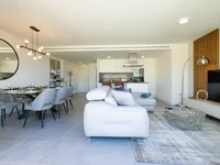The light and bright open concept living space incorporates a modern, fully equipped kitchen providing simple modern elegance with a breakfast bar and a formal dining area with large glass doors extending the living space to the terrace, which is equipped with an elegant awning for outdoor entertaining. A spiral staircase in this Estepona penthouse with sea views leads up to the magnificent private solarium, which enjoys pool, sea and mountain views.