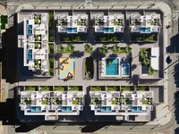 The interior design of each flat is carefully thought out to offer a functional and elegant environment, combining high quality finishes with an efficient layout. - Open Concept Living-Dining Room: Spacious living-dining room with direct access to the terrace or garden. Large windows that let in natural light and views to the outside. Modern decoration and designer furniture to create a sophisticated and cosy atmosphere. - Designer Kitchen: Fully fitted open plan kitchen with top of the range appliances (included in the price). Top quality porcelain stoneware worktop. Modern and functional kitchen furniture that maximises storage space. - Contemporary Style Bedrooms: Three spacious bedrooms with modern fitted wardrobes. The master bedroom has an en-suite bathroom and direct access to the terrace or garden. LED lighting and decorative details to create a relaxing atmosphere. - Modern bathrooms: Two complete bathrooms with designer bathroom fittings. Equipped with modern fittings, backlit mirrors and glass screens. Underfloor heating for greater comfort. - Private solarium (in penthouses) - Private Jacuzzi and pergola. - Outdoor kitchen for alfresco dining. - High quality artificial grass.