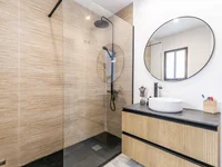 The largest balcony, accessible from the living room, offers panoramic views of the sea and mountains, while the smaller balcony from the bedroom provides a lovely view of the sea.