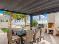 On the first level there is a large open courtyard with sun loungers, recreation areas with sofas, dining area and lounge. Ideal for those who appreciate comfort and want something special. There is also a summer kitchen with sink, grill and room for a large dining table - a cozy place for long summer evenings with delicious food. A small plot of garden with artificial grass is great for children's games.
