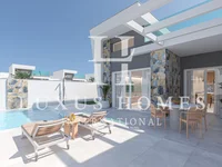 This exclusive boutique development presents a limited collection of contemporary single-level villas, thoughtfully designed to combine modern elegance, comfort, and seamless indoor-outdoor living. Each home features a private swimming pool with an integrated waterfall, spacious terraced areas, and a generous rooftop solarium with a summer kitchen—perfect for enjoying the Mediterranean sunshine all year round. The villas offer three spacious bedrooms and two fully fitted bathrooms, finished to a high standard with sleek fixtures, mirrors, and integrated lighting. The open-plan living and dining area is enhanced by a striking double-height ceiling, creating a sense of space and light. A fully equipped modern kitchen includes premium appliances such as an integrated refrigerator, hob, oven, microwave, extractor hood, and dishwasher, complemented by elegant cabinetry and Silestone-style countertops. Designed for efficiency and comfort, the homes feature high-performance acoustic insulation, near-zero energy consumption, double-glazed windows with solar protection, built-in wardrobes with drawer units, LED ambient lighting, and pre-installation for ducted air conditioning. Set within a vibrant community surrounded by golf courses, sports facilities, shops, bars, and restaurants, the location also offers easy access to beautiful beaches with calm waters, ideal for year-round enjoyment. Excellent motorway connections ensure smooth travel throughout the region. This is a rare opportunity to own a stylish, low-maintenance villa offering privacy, premium finishes, and exceptional lifestyle appeal—perfect for permanent living, holidays, or investment.