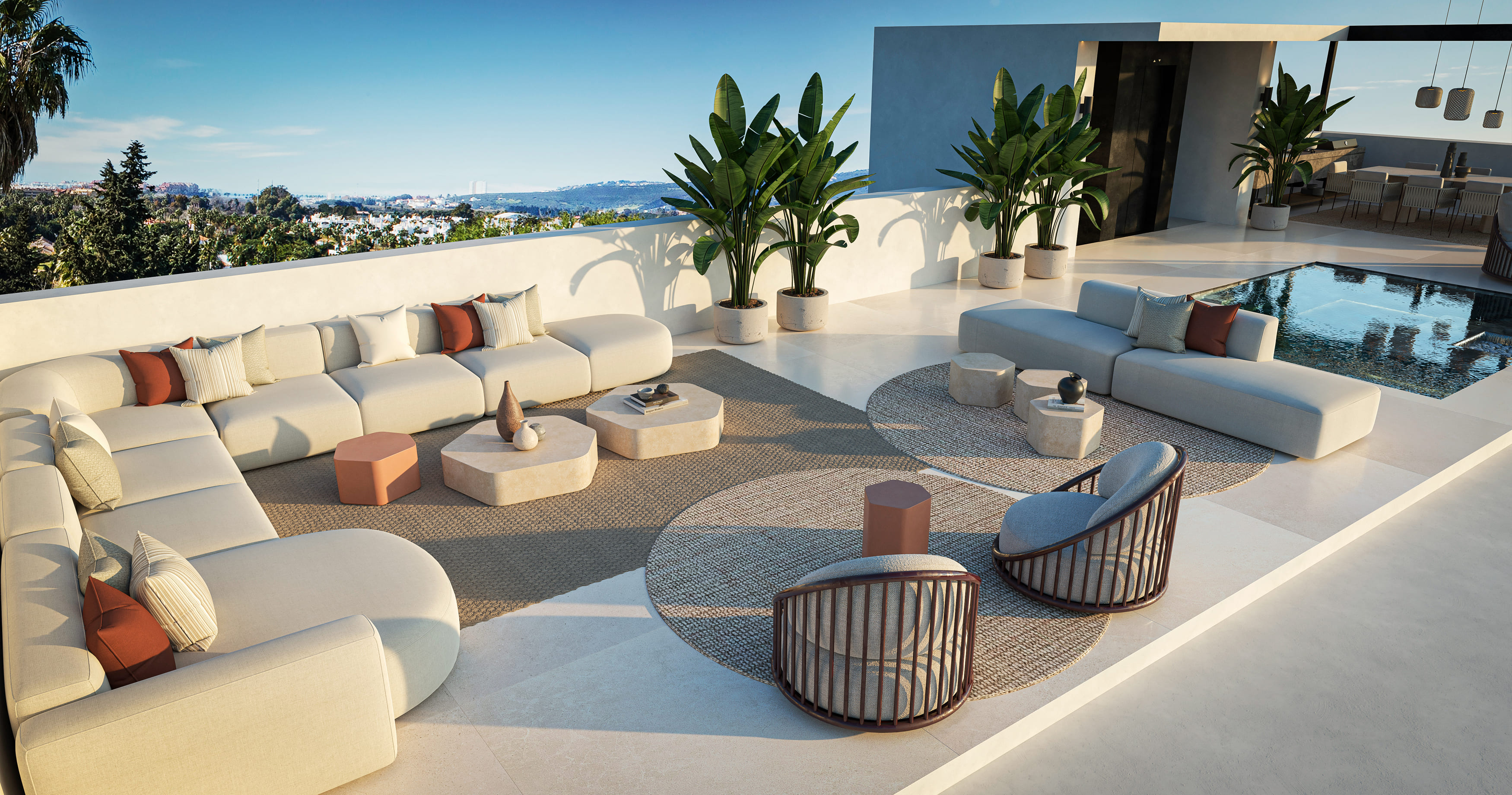 The exterior design of the villas in Estepona is impressive, with features that stand out for their elegance and functionality. Each villa boasts a private pool, perfect for enjoying the sunny climate of the region. The spacious terraces offer an ideal space for outdoor entertainment or simply relaxing while enjoying the views. Additionally, the solarium provides an extra place for sunbathing and enjoying moments of tranquility. The inclusion of an electric car charging point underscores the commitment to sustainability and modernity.