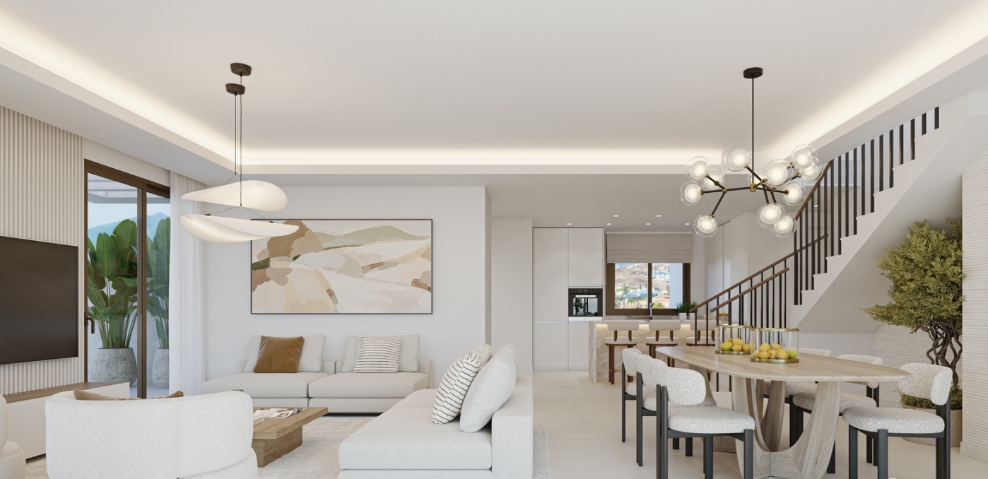 The outdoor spaces of these properties are designed to maximize comfort and enjoyment of the Mediterranean climate. Each residence features a private terrace, ideal for relaxing or entertaining guests. Additionally, some types include a solarium, providing additional outdoor space with panoramic views. The presence of a private garden in each unit adds a touch of nature and privacy. For those who value sustainability, the residences are equipped with charging points for electric cars. The option of a private pool in some units offers an additional luxury to enjoy in the privacy of the home.
